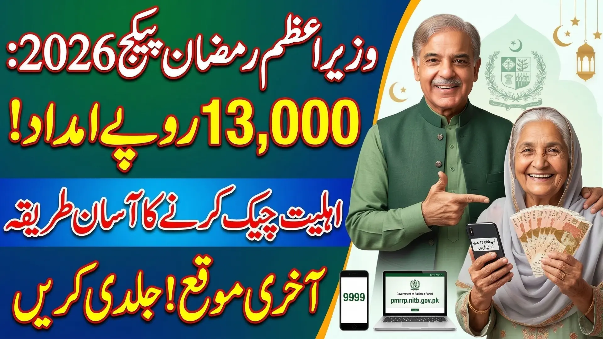 اس پروگرام کے لیے نئی رجسٹریشن کی ضرورت نہیں کیونکہ حکومت BISP اور نادرا کے ڈیٹا کے ذریعے مستحق افراد کو منتخب کر رہی ہے۔ آپ اپنا CNIC نمبر سرکاری پورٹل pmrrp.nitb.gov.pk پر درج کر کے یا 9999 سروس کے ذریعے اہلیت معلوم کر سکتے ہیں، اور اہل افراد کو رمضان میں براہ راست 13,000 روپے امداد دی جائے گی۔