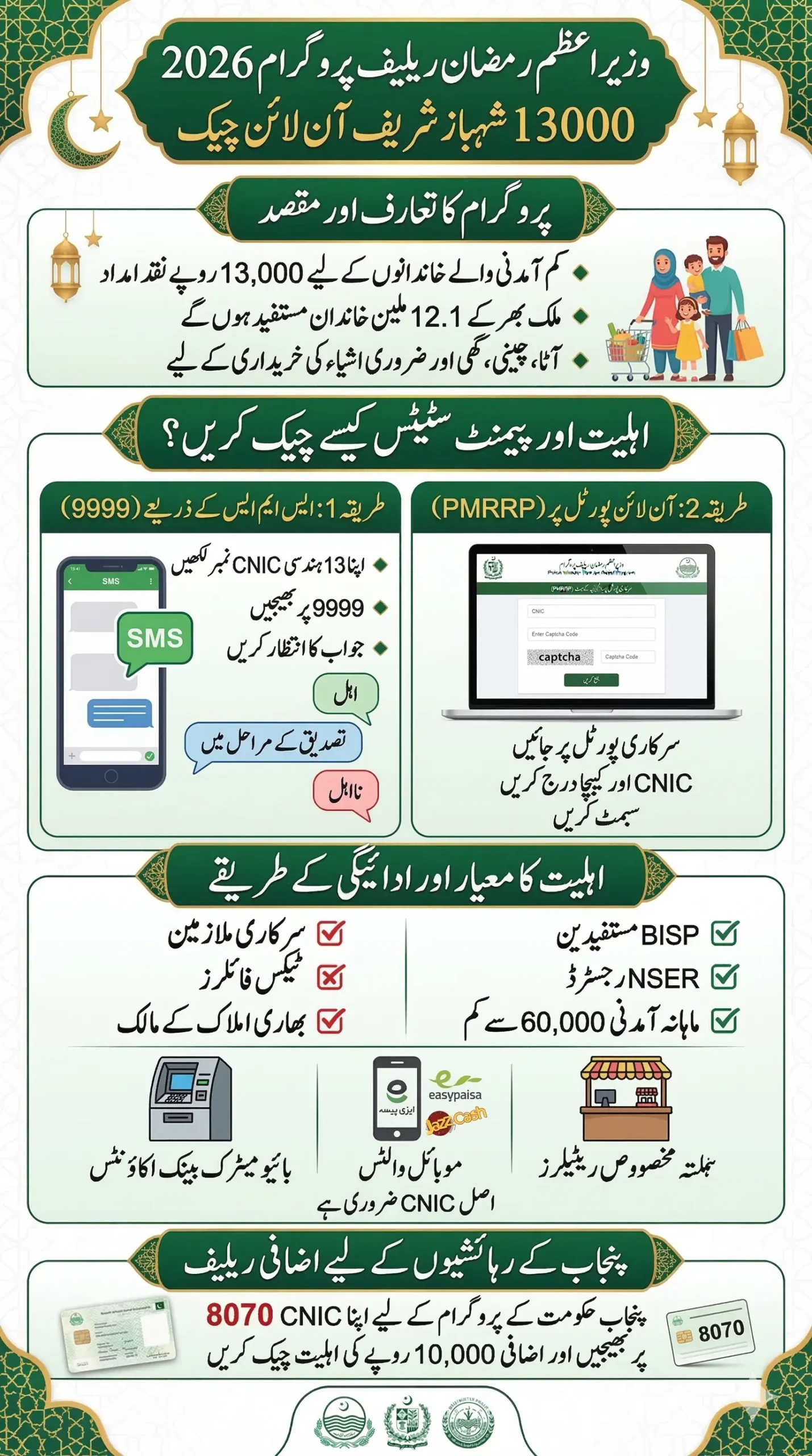 The 13000 Shahbaz Sharif Online Check is the official way for citizens to verify their eligibility for the PM Ramzan Relief Payment 2026. By sending your CNIC to 9999 or checking through the PMRRP portal, you can quickly confirm whether your household will receive the Rs.13,000 financial assistance.