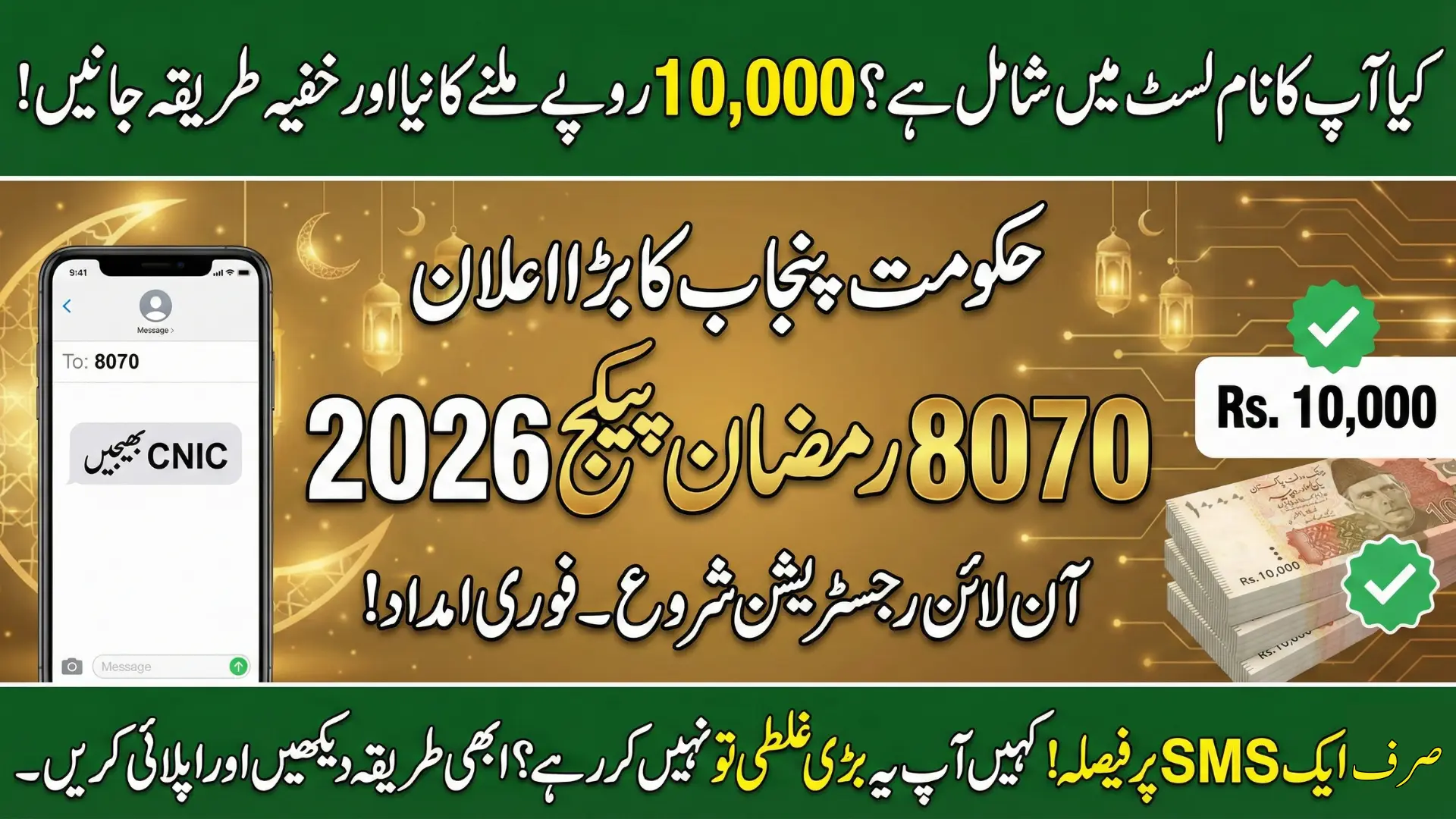 8070 Registration Online 2026 has officially started in Punjab to provide Rs. 10,000 Ramzan cash assistance to deserving families. The program uses CNIC-based verification linked with PSER data to ensure transparent and fair selection. Applicants can register online through the official 8070 web portal or by sending their CNIC via SMS to 8070, without visiting offices or paying agents.