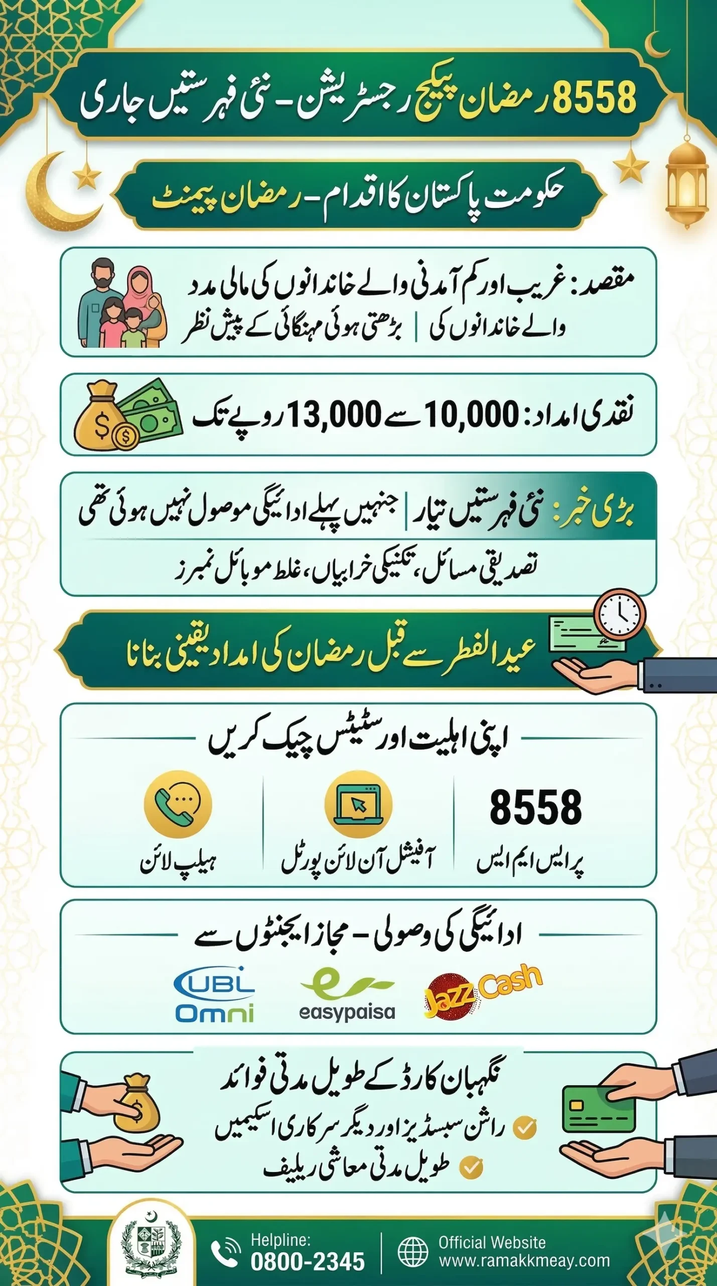 The 8558 Ramzan Package Registration program is providing financial relief to deserving families across Pakistan during the holy month. According to the latest update, the government has prepared new beneficiary lists for those who were eligible but did not receive their Rs.10,000 or Rs.13,000 Ramzan payment earlier.