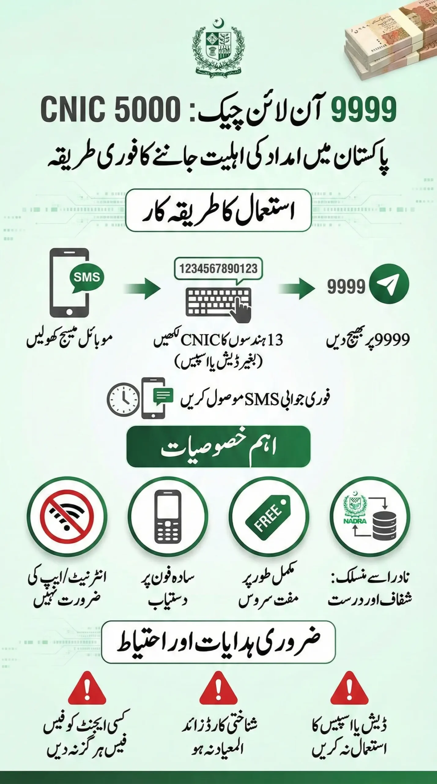 The 9999 Online Check CNIC 5000 system allows citizens in Pakistan to instantly verify eligibility for Rs. 5,000 government financial aid through a simple SMS. By sending your 13-digit CNIC number to 9999, you can check your status within seconds no internet, no apps, and no office visits required.