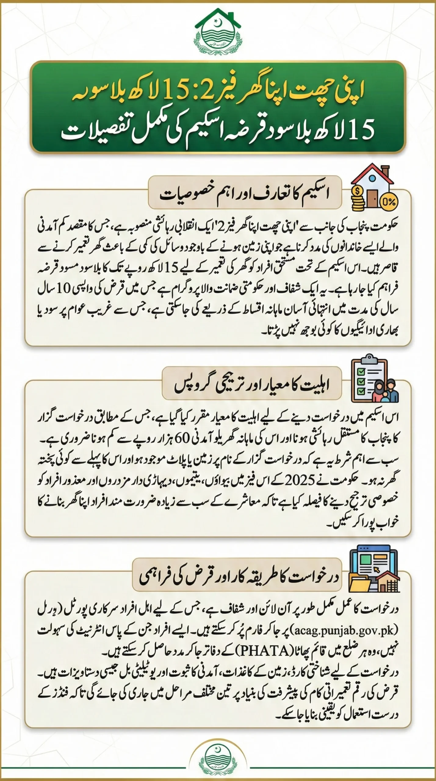 Apni Chhat Apna Ghar Phase 2 is a powerful housing scheme by the Punjab Government offering up to Rs. 15 lakh interest-free loans to deserving families who own land but lack resources to build a home. Eligible Punjab residents with monthly income below Rs. 60,000 can apply through the official portal acag.punjab.gov.pk.