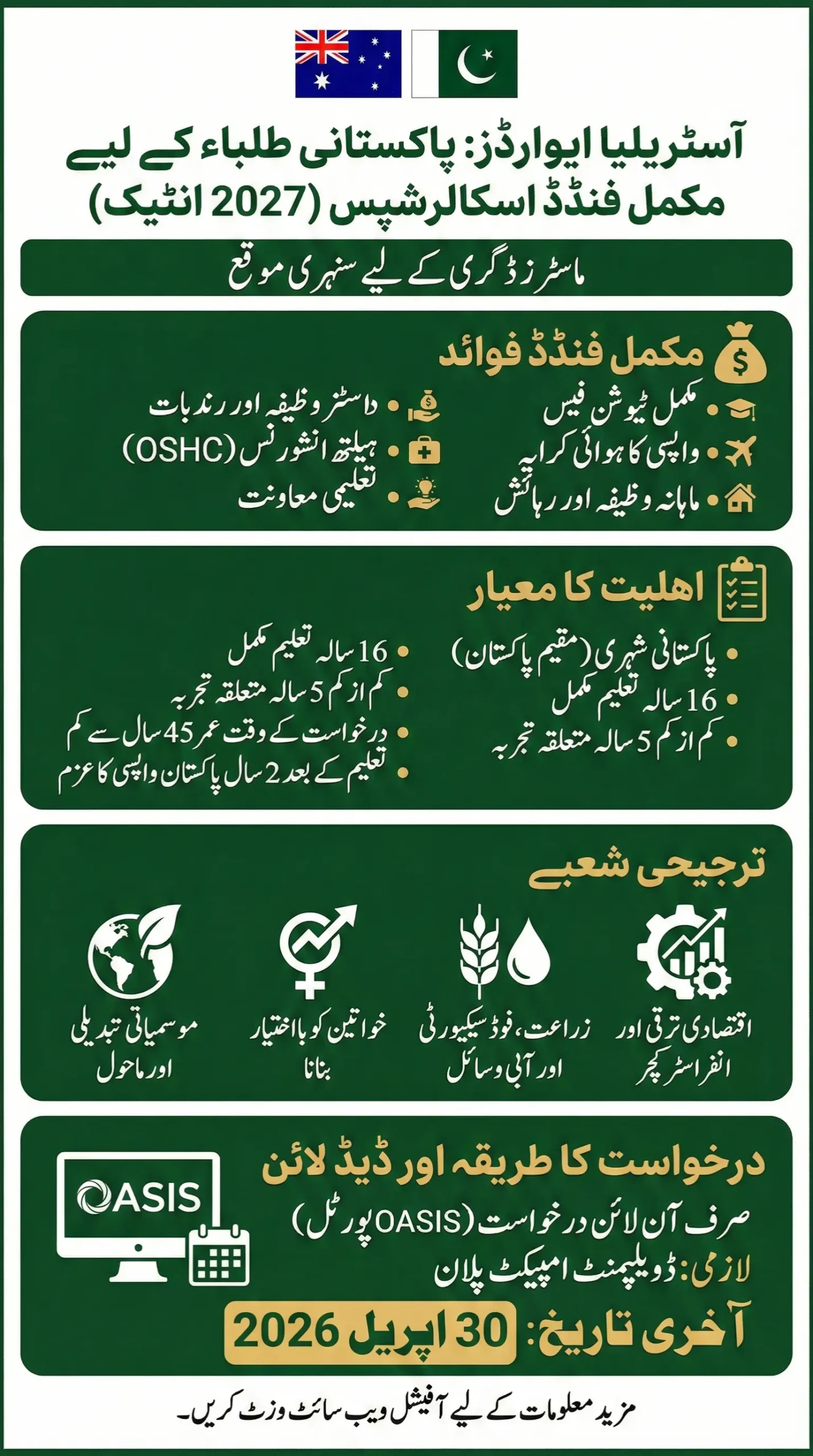 Pakistani citizens with 16 years of education, at least five years of work experience, and strong leadership potential can apply. Priority is given to fields like climate change, women empowerment, agriculture, and economic development. Applications opened on 1 February 2026 and close on 30 April 2026, with online submission through the OASIS portal only.