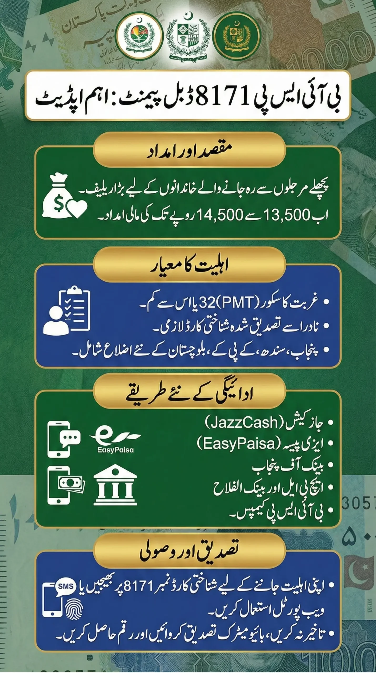 The BISP 8171 Double Payment initiative provides critical relief, offering Rs. 13,500 to Rs. 14,500 to families missed in previous phases. This Phase 3 update expands coverage to new districts across Punjab, Sindh, KPK, and Balochistan. Delivering on the title’s promise, checking eligibility is simple: SMS your CNIC to 8171 or use the web portal to confirm a PMT score of 32 or lower.