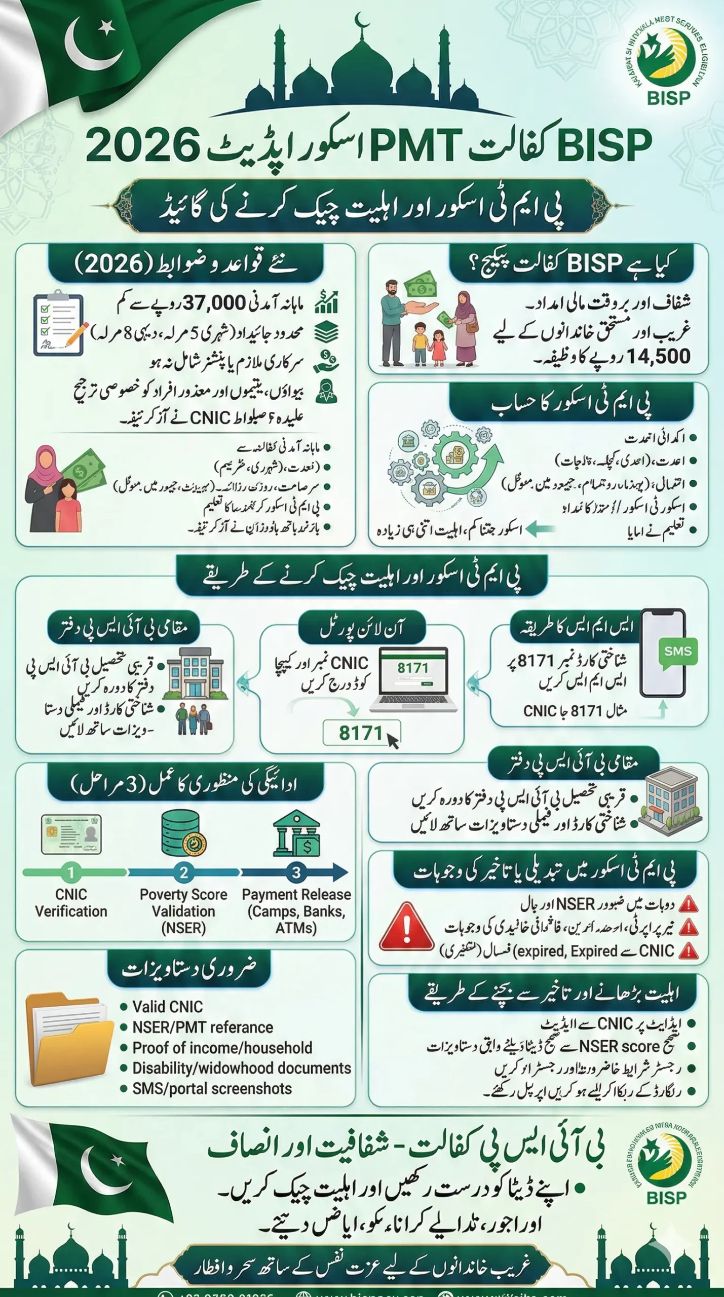 BISP Kafalat PMT Score Update 2025 is a major step by the Government of Pakistan to provide transparent and timely financial assistance to poor and deserving families. As per the new rules of September 2025, only those families whose monthly income is less than Rs. 37,000, who have limited land or property, and who do not include any government employees or pensioners will be eligible. Along with this, special priority has been given to widows, orphans and disabled persons so that the weaker sections can get immediate assistance.