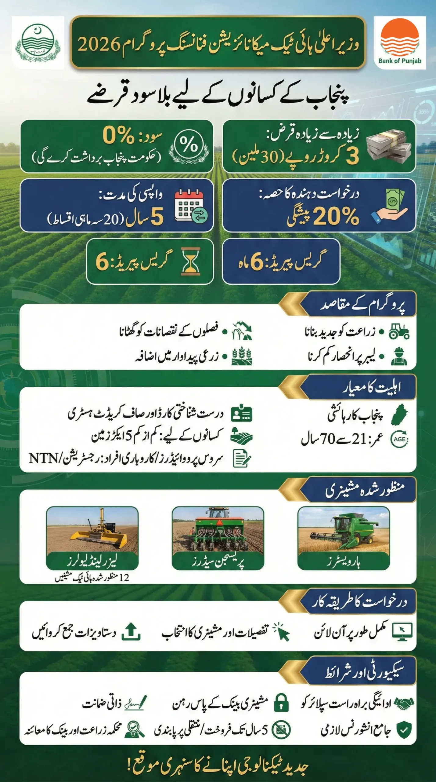 The CM High Tech Mechanization Financing Program 2026 offers interest-free loans up to PKR 30 million to farmers, service providers, and agri-entrepreneurs in Punjab to promote modern agriculture. The scheme, backed by the Government of Punjab and implemented through the Bank of Punjab, helps applicants purchase approved high-tech agricultural machinery with only 20% upfront equity.