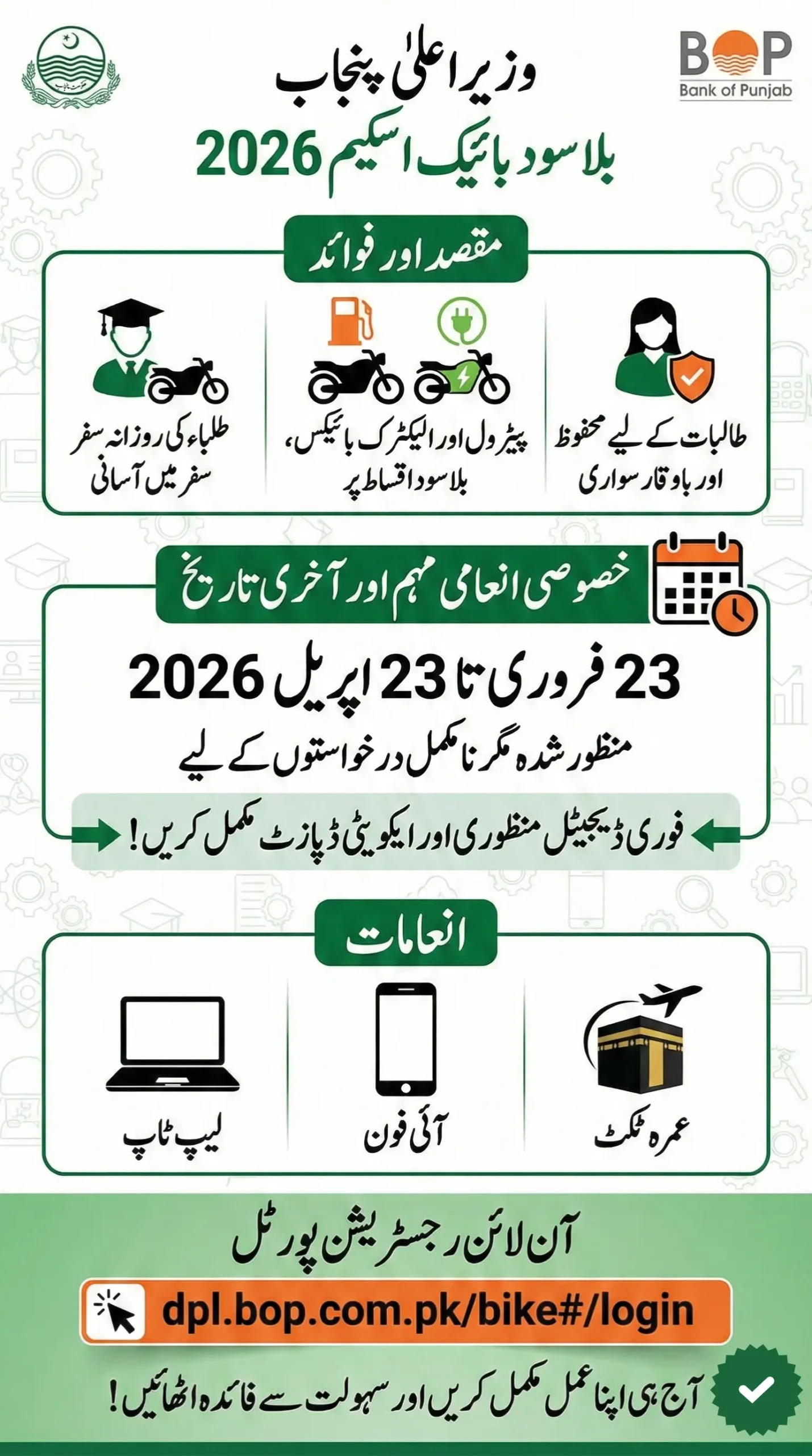To encourage timely completion, the Bank of Punjab is running a reward lottery for students under the CM Interest-Free Bike Scheme.