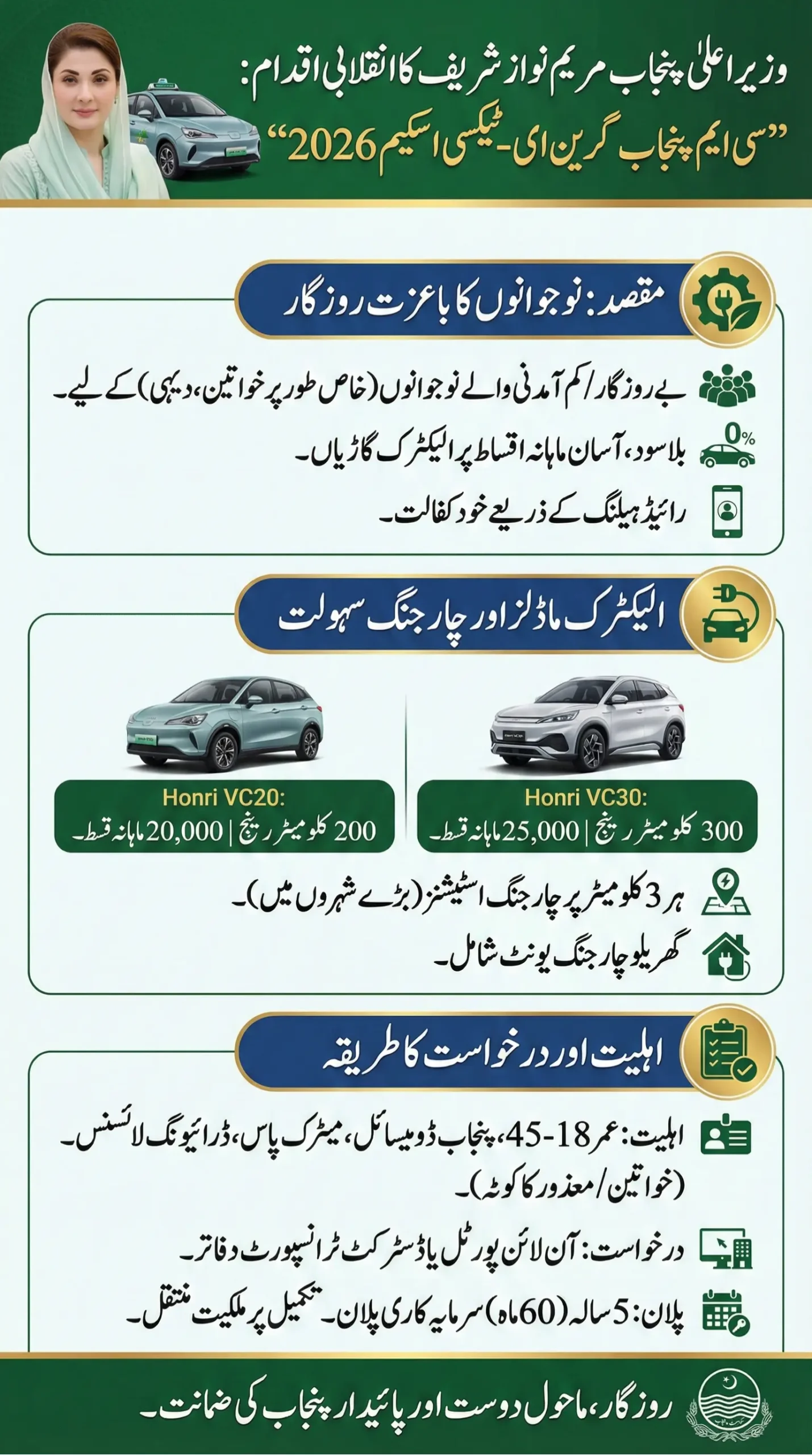 The CM Punjab Green E-Taxi Scheme is a bold and forward-thinking step by Chief Minister Maryam Nawaz administration in 2026. This initiative aims to empower unemployed and underemployed youth, especially from rural areas and marginalized communities, by offering them electric vehicles on zero-interest, easy monthly installment plans.