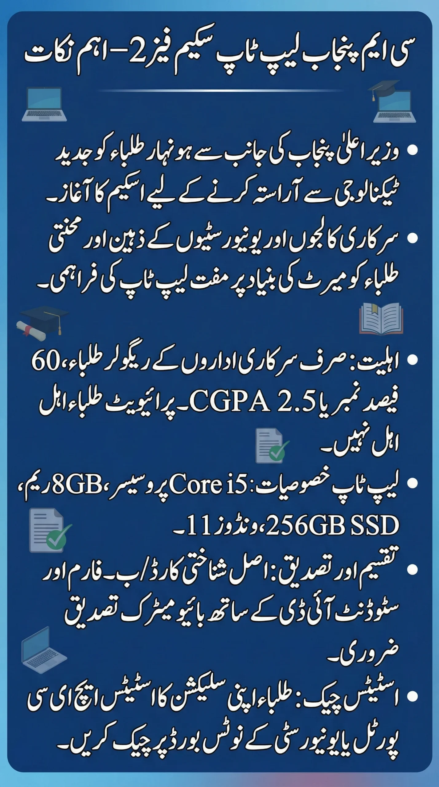 The Punjab Laptop Scheme Phase 2 is a major step by the government to modernize education and support students across the province. With strict eligibility, transparent verification, and upgraded laptops, this scheme ensures that every deserving student gets a fair chance.