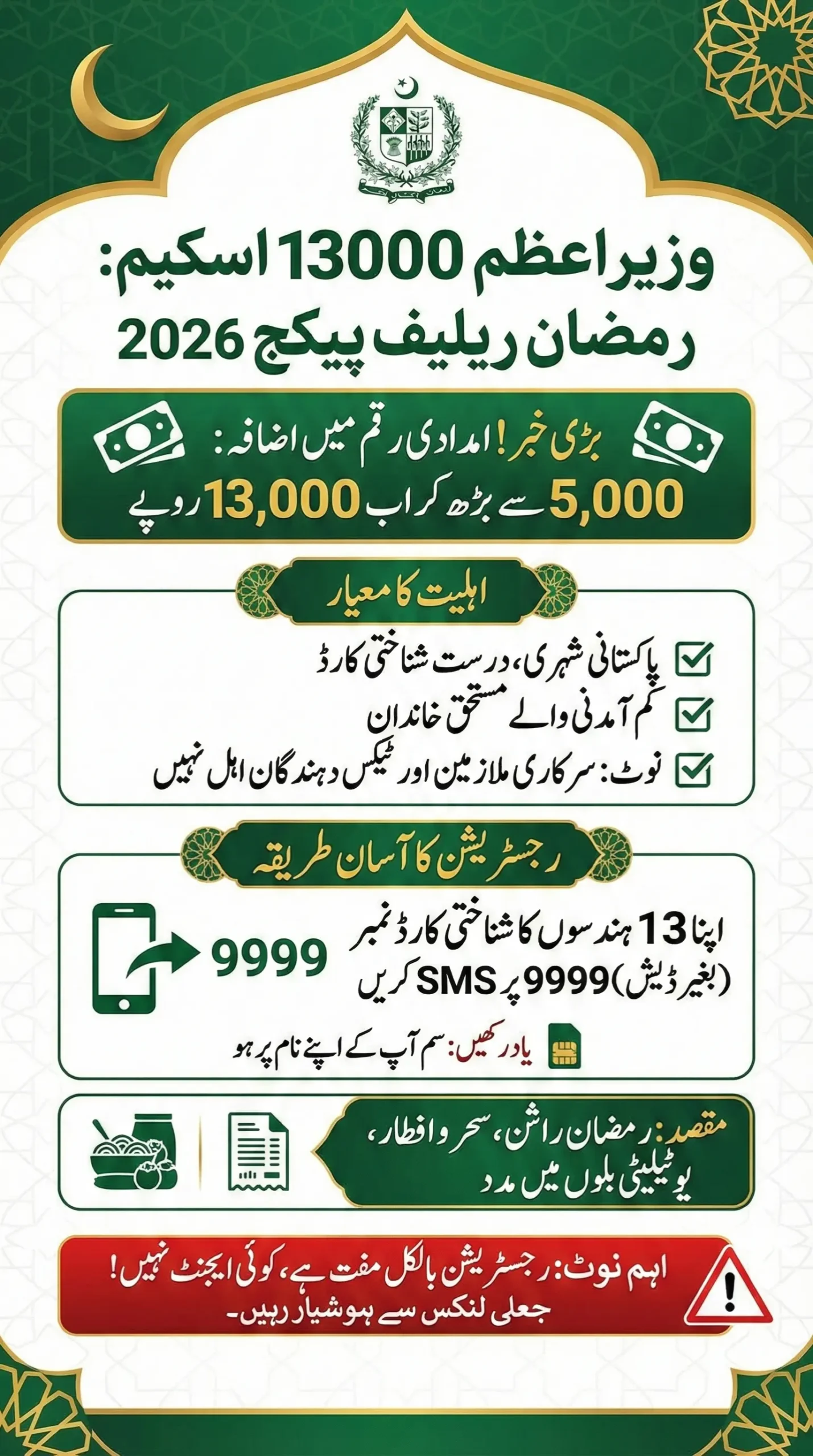 The Prime Minister 13000 Scheme has been updated for Ramzan 2026 to provide stronger financial relief to deserving families across Pakistan. Under the latest government notification, cash assistance has been increased from Rs. 5,000 to Rs. 13,000, keeping the simple SMS 9999 registration method in place with improved CNIC and database verification.