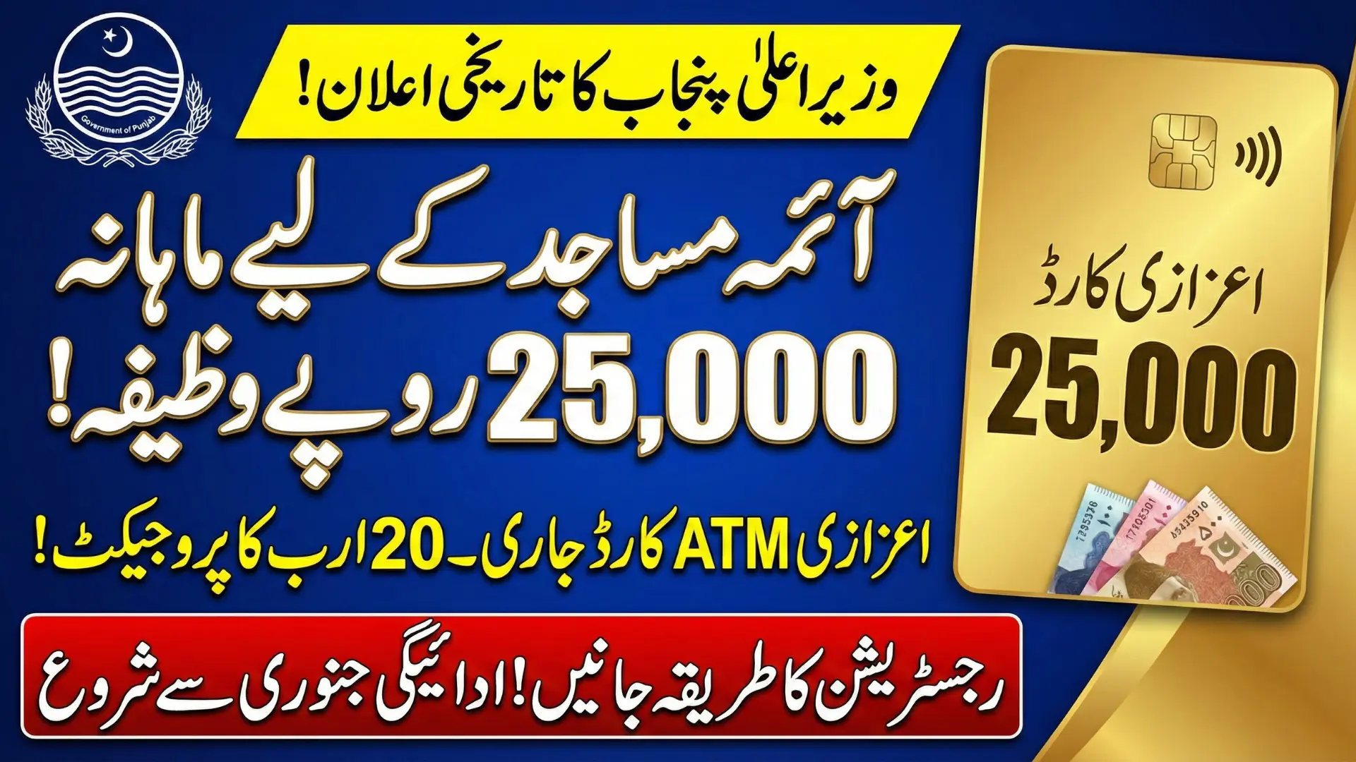 The Imam Masjid Wazifa Program 2026 is a landmark welfare initiative by the Punjab government that brings long-awaited financial security to mosque Imams. Through this program, every registered Imam will receive a monthly honorarium of Rs 25,000, backed by a Rs 20 billion annual budget.
