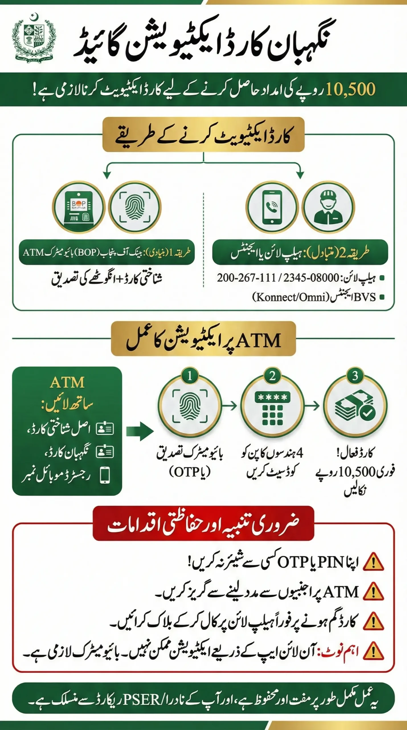 Without completing the Nigehban Card activation process, you cannot withdraw your Rs. 10,500 assistance, use the card at registered shops, or receive future installments. This step also protects you from fraud, card misuse, and identity theft.