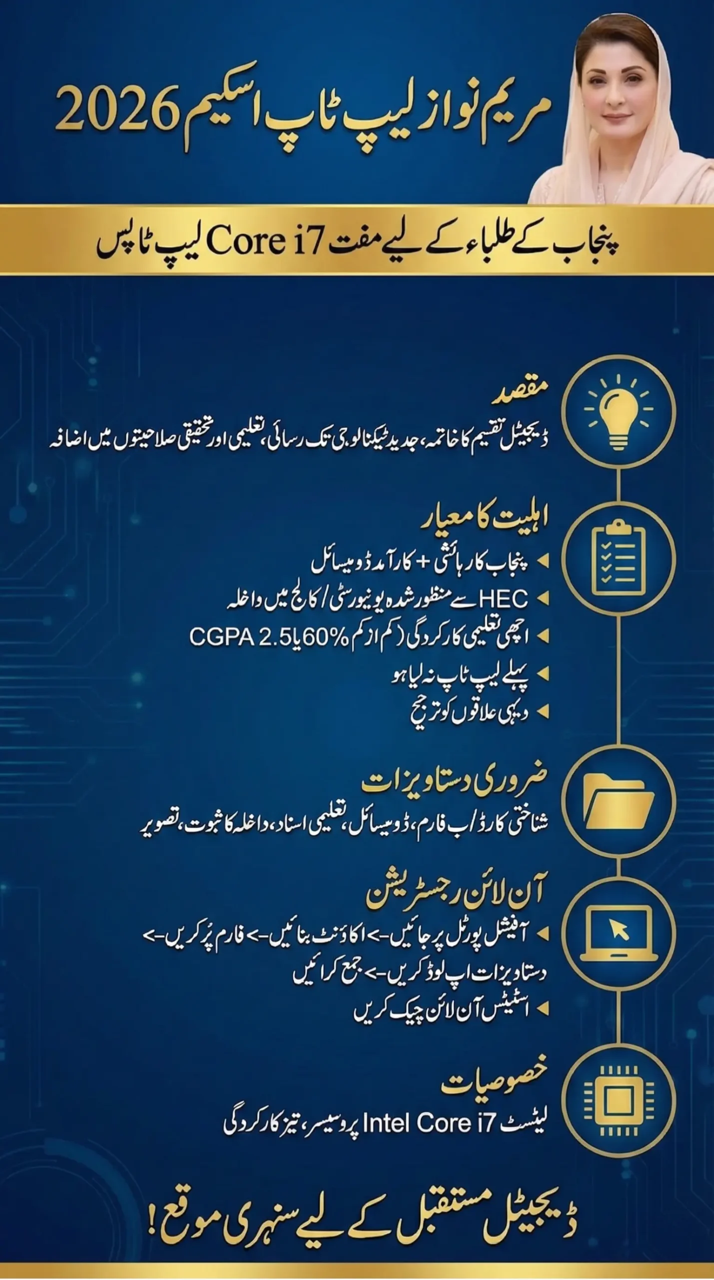 The Maryam Nawaz Laptop Scheme 2026 is a golden opportunity for hardworking students in Punjab to get access to modern technology without spending a single rupee. It not only supports students in their education but also prepares them for the digital future.