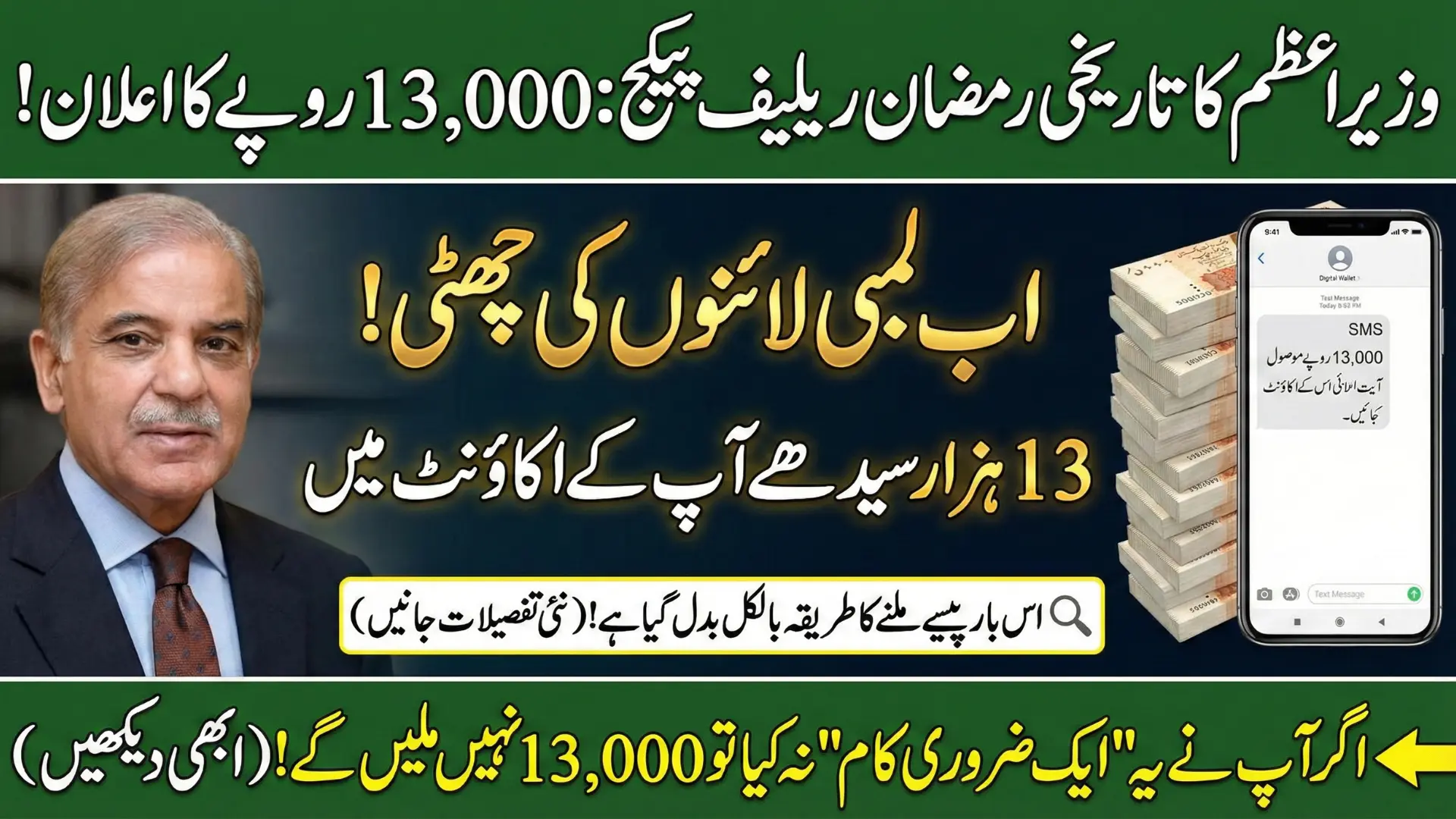 Prime Minister Shehbaz Sharif has launched the PM Ramzan Package 13000 for Ramadan 2026, offering Rs 13,000 cash aid to 12.1 million poor and deserving families across Pakistan, including Gilgit-Baltistan and Azad Kashmir. The relief will be transferred directly to beneficiaries through digital wallets and bank accounts to ensure transparency and quick delivery.