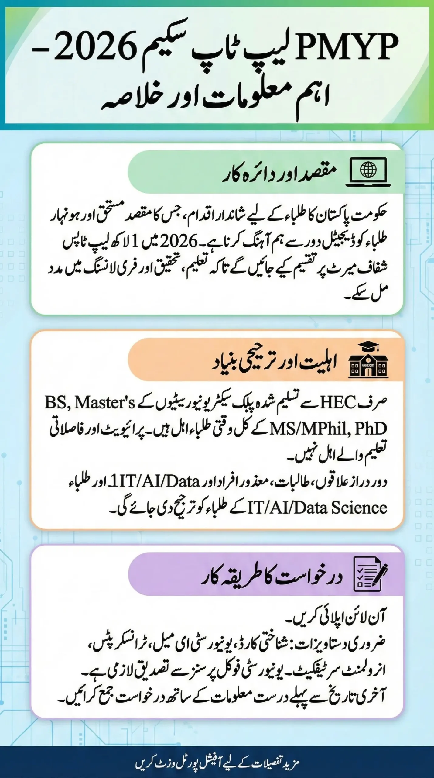 Under this scheme, students selected on merit will be given laptops with modern features so that they do not lag behind in research, projects and digital learning. National Identity Card, enrollment certificate of the educational institution and other necessary documents are required to apply. Moreover, an online portal has also been provided to ensure the transparency of the scheme.