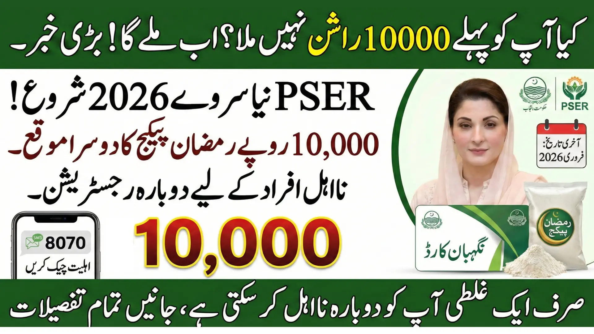 The PSER New Survey to register ineligible people for 10000 Rashan payment gives families a fresh chance to qualify for the Rs. 10,000 Nigehban/Rashan support in Ramzan 2026. The Punjab government is updating records to include previously unregistered or wrongly marked households. Eligible Punjab residents with low income and PMT score below 35 can apply online at pser.punjab.gov.pk.