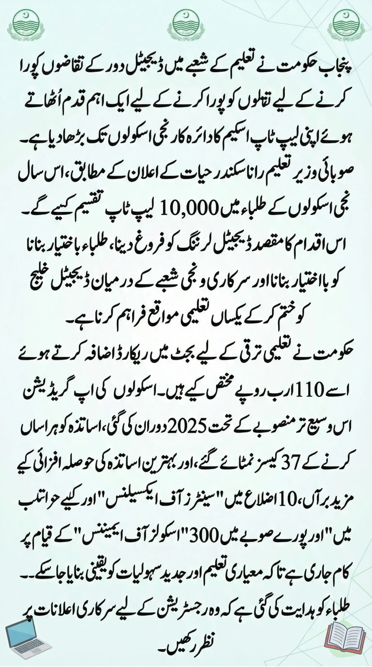 With an increased education development budget of Rs. 110 billion, Punjab has also upgraded 268 schools, addressed 37 teacher harassment cases, launched Teacher Takreem Awards, and begun work on Centres of Excellence and 300 Schools of Eminence. This initiative empowers students, bridges the digital gap, and strengthens education across the province.