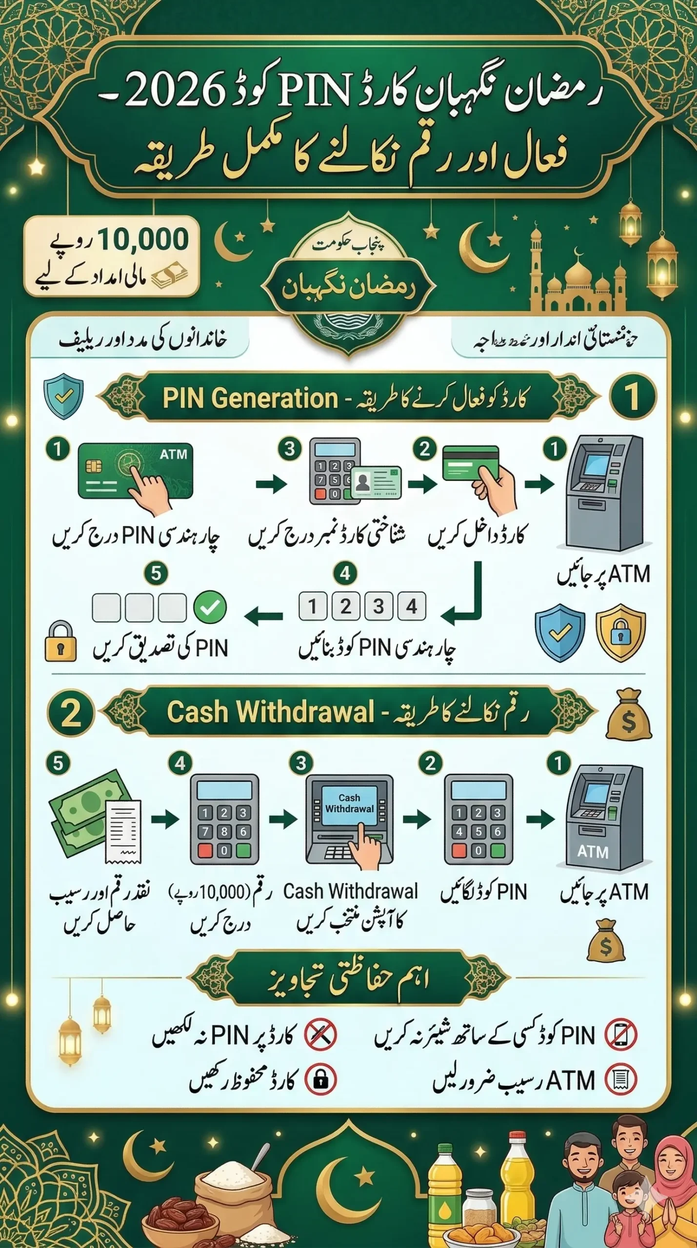 The Ramzan Nigehban Card PIN Code 2026 is required to activate the government assistance card and withdraw the Rs 10,000 Ramadan relief payment. Beneficiaries must first generate a secure 4-digit PIN at an authorized ATM using their CNIC for verification. Once the PIN is successfully created, the card becomes active and users can withdraw the full amount through ATM machines.