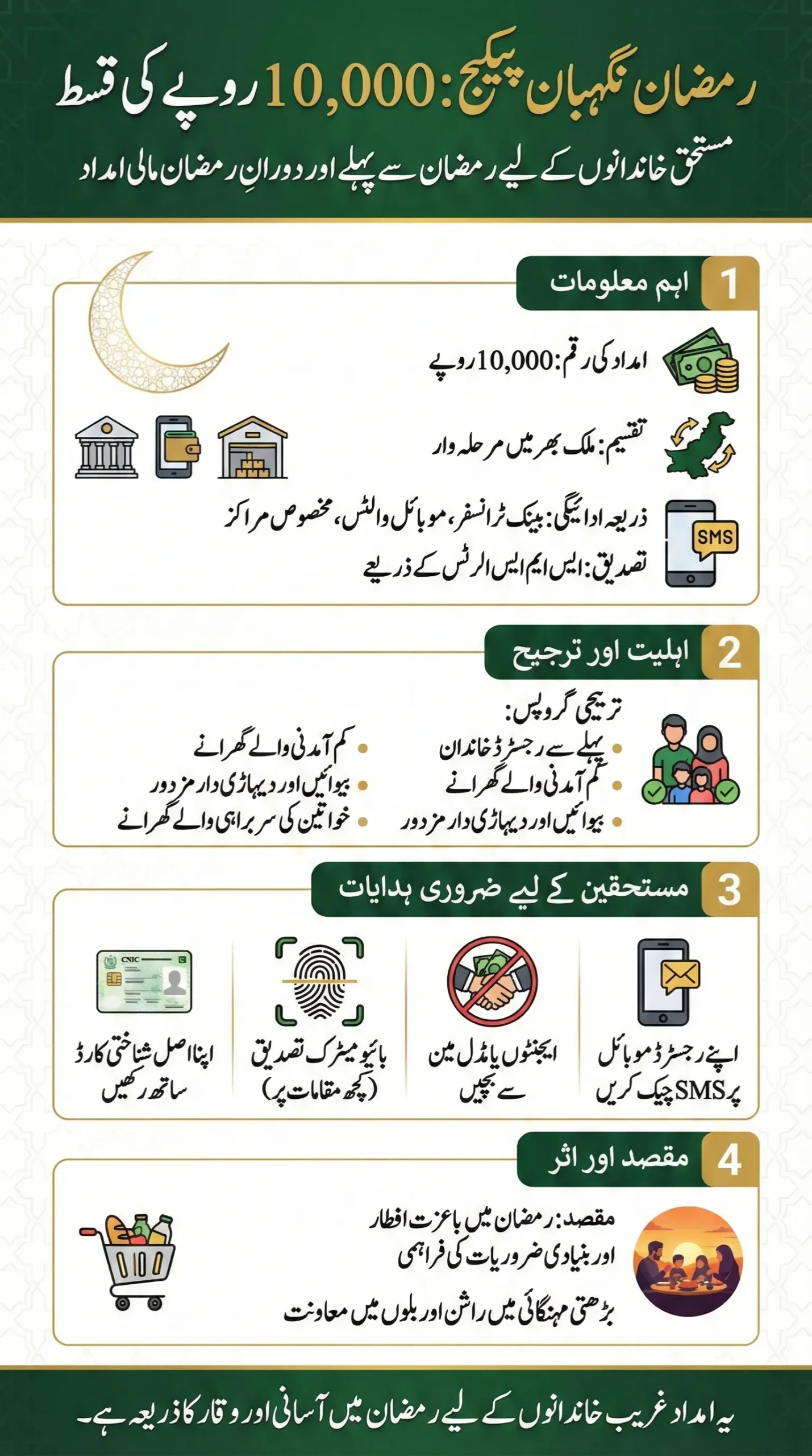 The Ramzan Nighaban Package is a government-backed social relief scheme designed to support deserving families during the holy month of Ramzan. Under this program, Rs. 10,000 is provided in the form of a cash installment (qist) to help households manage essential expenses.