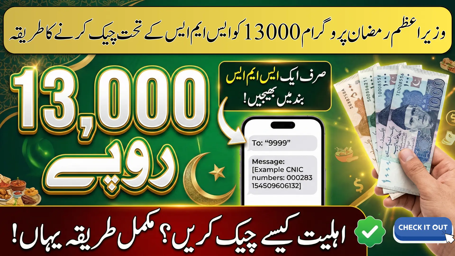 The Wazir e Azam Ramzan Package 2026 offers Rs 13,000 cash assistance to low-income families across Pakistan before Ramzan. Eligible citizens can easily check their status by sending their 13-digit CNIC number to 9999 via SMS or through the official online portal. The program targets NSER-registered households, including BISP and Ehsaas beneficiaries, while government employees and high-income taxpayers are excluded.